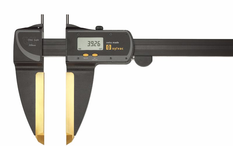 Sylvac's lightweight heavy-duty electronic digital calipers include sizes up to 3000mm and resolution of .01mm. This has been achieved by designing a well-balanced instrument utilizing state-of-the-art material technology. Functional parts are made of the latest wear-resistant materials. Hollow section aluminum beam reinforced by two stainless steel guides. This system assures perfect guidance and protects the beam against shocks.
